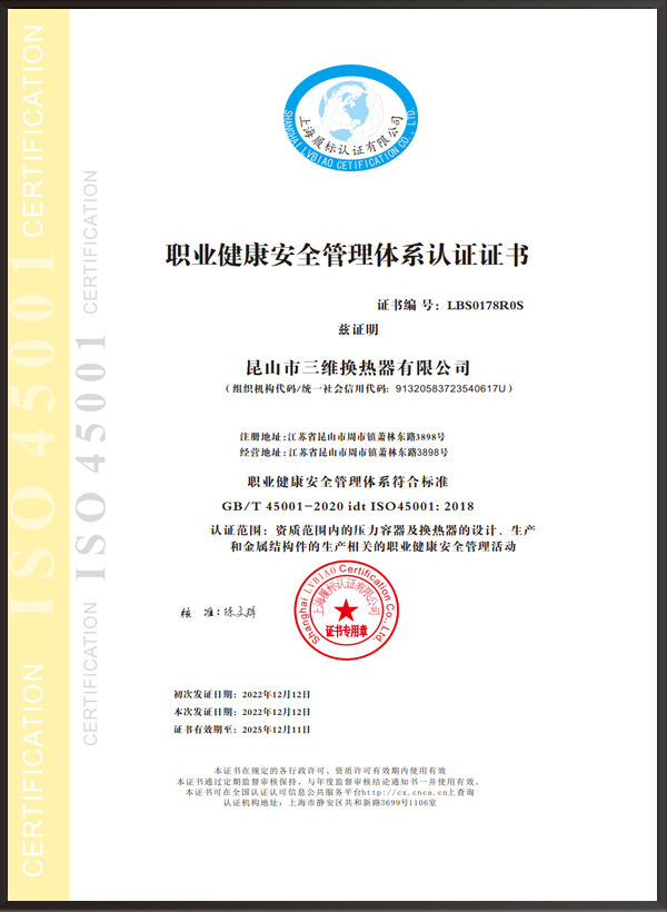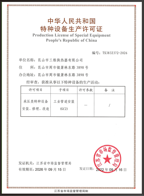 A2壓力容器制造許可證,D1/D2壓力容器設計許可證;GC2管道安裝許可證;ASME U/NB鋼??;ISO9001、ISO45001、ISO14001體系認證證書等。